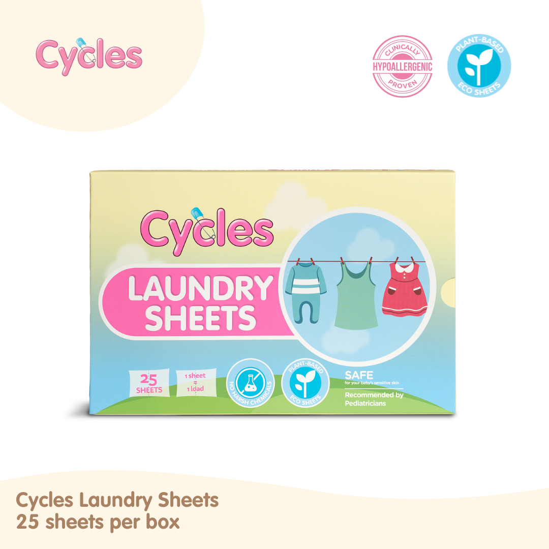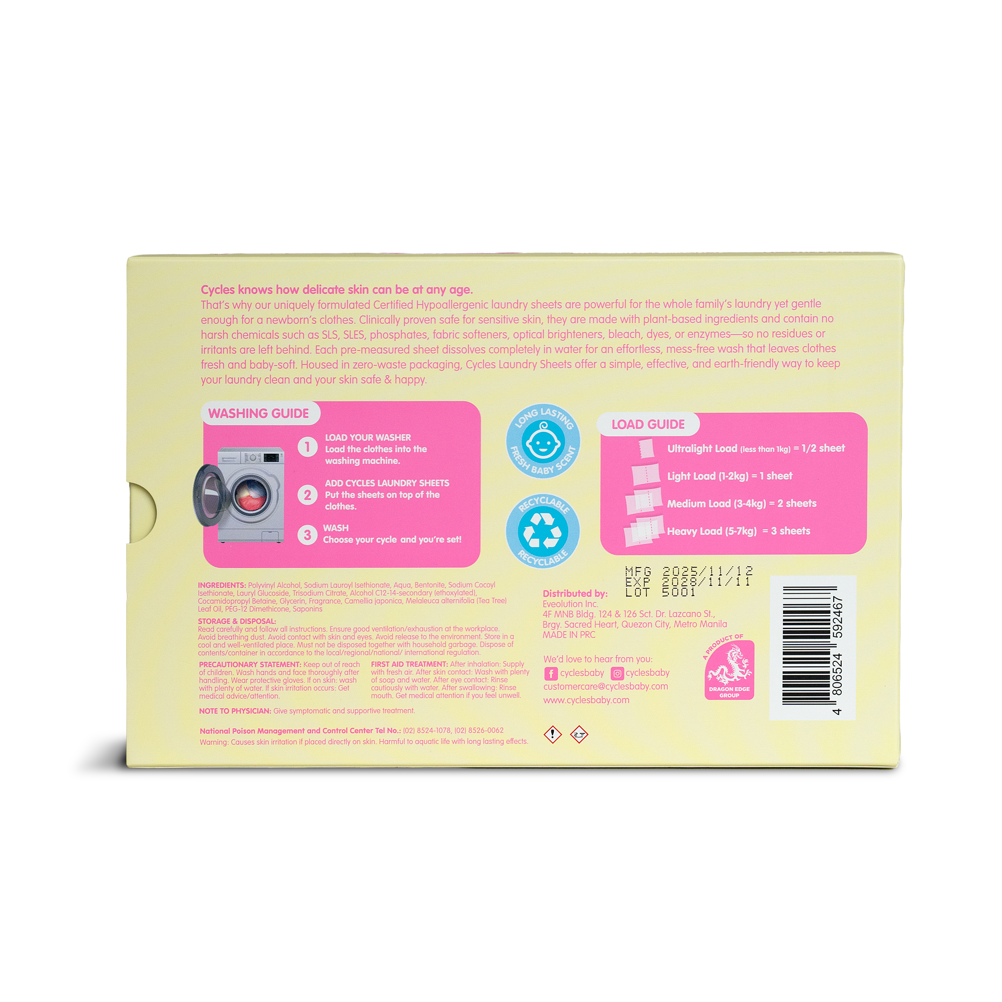 Cycles knows how delicate skin can be at any age.Our uniquely formulated Certified Hypoallergenic laundry sheets are powerful for the whole family's laundry yet gentle enough for a newborn's clothes. Clinically proven safe for sensitive skin, they are made with plant-based ingredients and contain no harsh chemicals such as SLS, SLES, phophates, fabric softeners, optical brighteners, bleach, dyes or enzymes -- so no residues or irritants are left behind. Each pre-measure sheet dissolves completely in water for an effortless, mess-free wash that leaves clothes fresh and baby-soft. Housed in zero-waste packaging, Cycles Laundry Sheets offer a simple, effective, and earth-friendly way to keep your laundry clean and your skin safe & happy. WASHING GUIDE1. LOAD YOUR WASHER. Load the clothes into the washing machine.2. ADD CYCLES LAUNDRY SHEETS. Put the sheet on top of the clothes.3. WASH. Choose your cycle and you're set. LOAD GUIDE1. Ultralight Load (less than 1kg) = 1/2 sheet2. Light Load (1-2kg) = 1 sheet