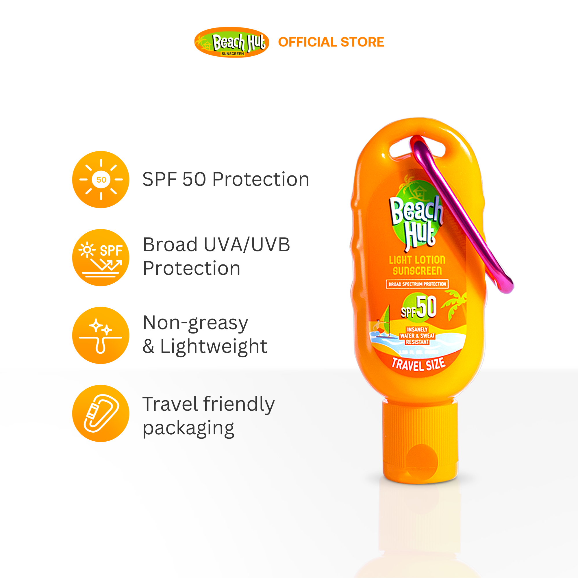 This Beach Hut Sunblock SPF50 Light Lotion Sunscreen 40ml with Carabiner is easy to carry around, and if ever you forget your sunscreen, no worries as this is already clipped in your bag, so you could get yourself protected wherever, whenever!