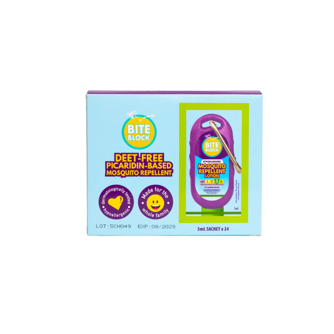 Your trial-friendly mosquito protection.Discover safe, effective protection in a handy sachet with Bite Block Mosquito Repellent Lotion 5mL. Powered by DEET-free, Picaridin-based protection, it offers families a safer alternative to traditional repellents while guarding against mosquito bites.With Mosquito Protection Factor 3 (MPF 3), each sachet gives up to 6 hours of defense against mosquitoes. Its trial-friendly 5mL pack makes it easy to try, share, or bring along for quick outdoor moments—whether it’s a short walk, playtime in the park, or an errand run.